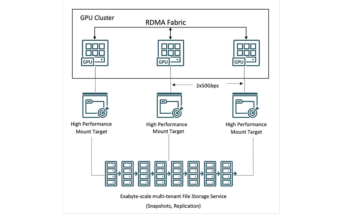 The diagram shows GPU cluster nodes powered by NVIDIA A100 GPUs and networking with less than two-microsecond latency.