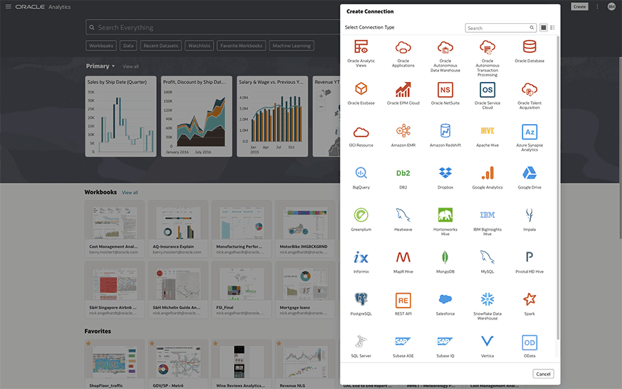 Oracle Analytics connects to many data sources, both Oracle and non-Oracle, including other cloud providers (e.g., Azure and Google), social feeds, IoT sources, data lakes, and more. Connected data sources can include cloud, on-premises, or self-service data sets. Use self-service to blend third-party or personal sources for a complete business view.