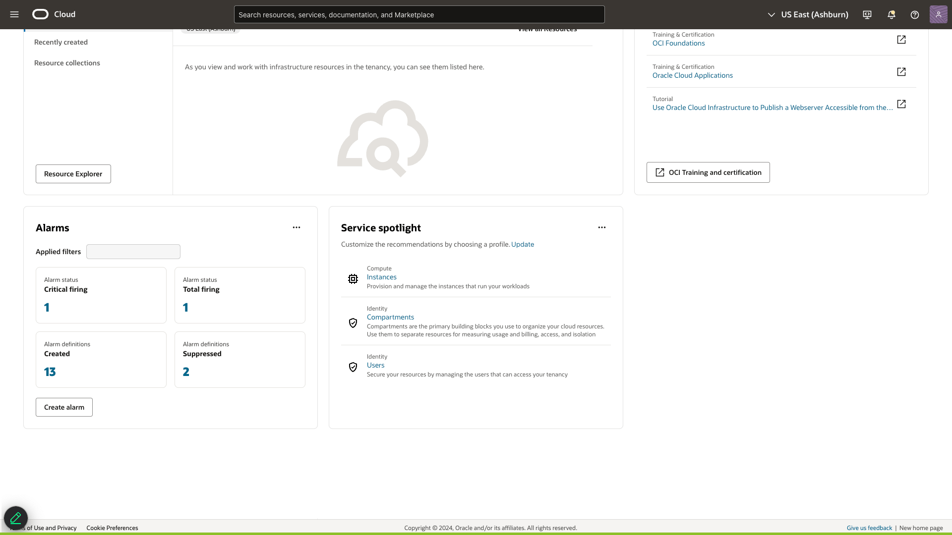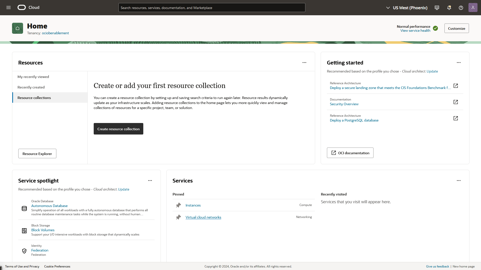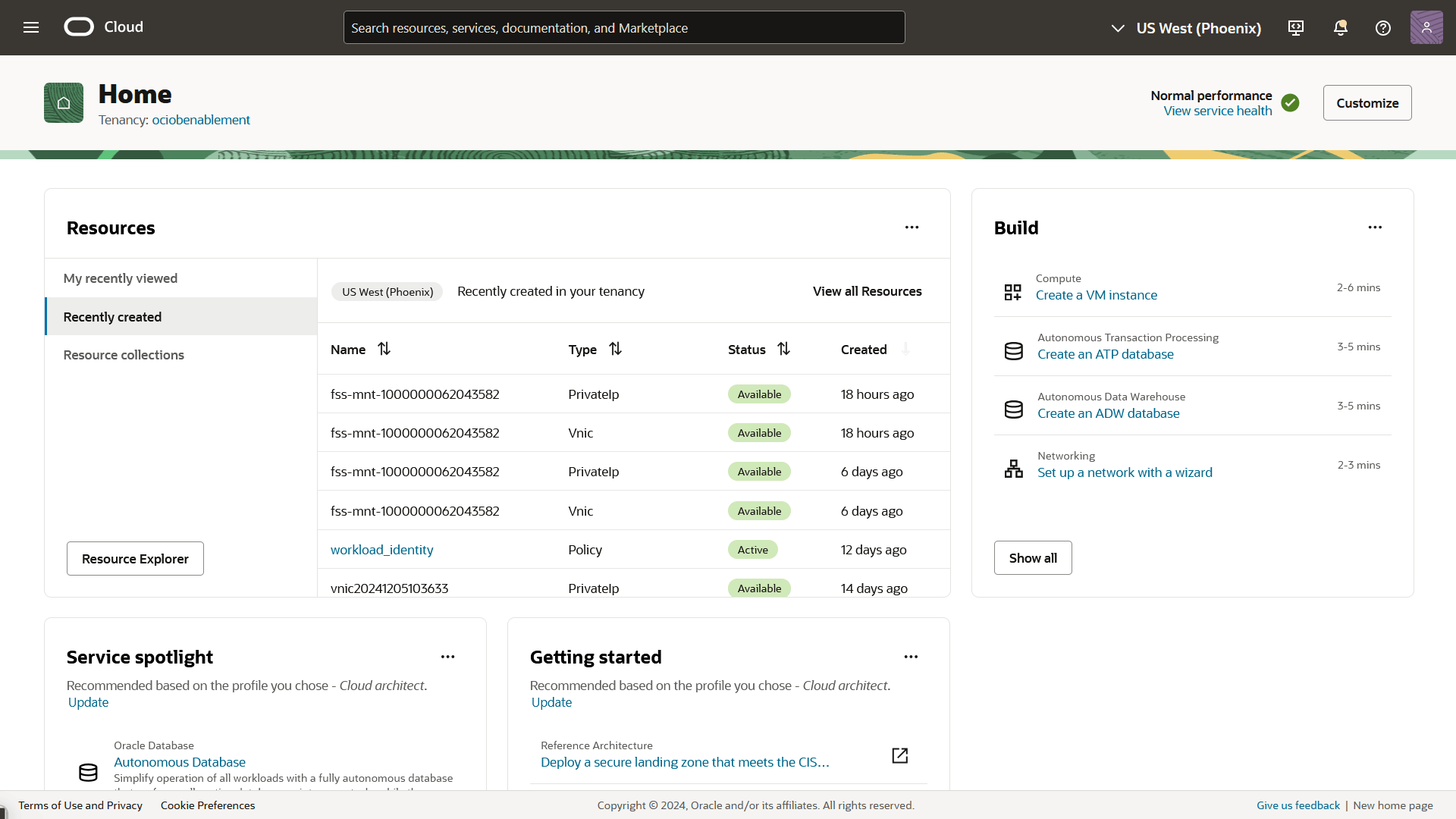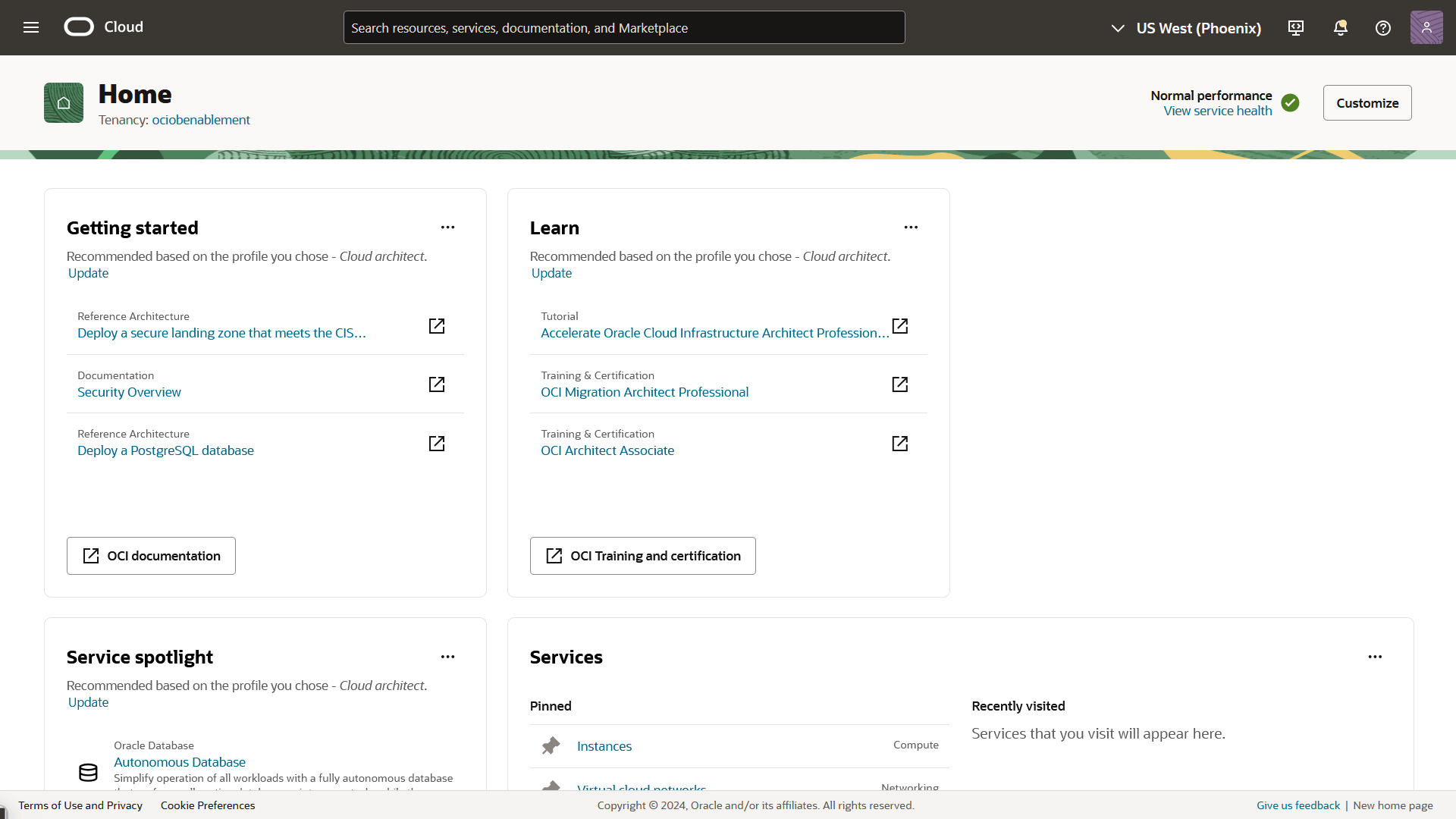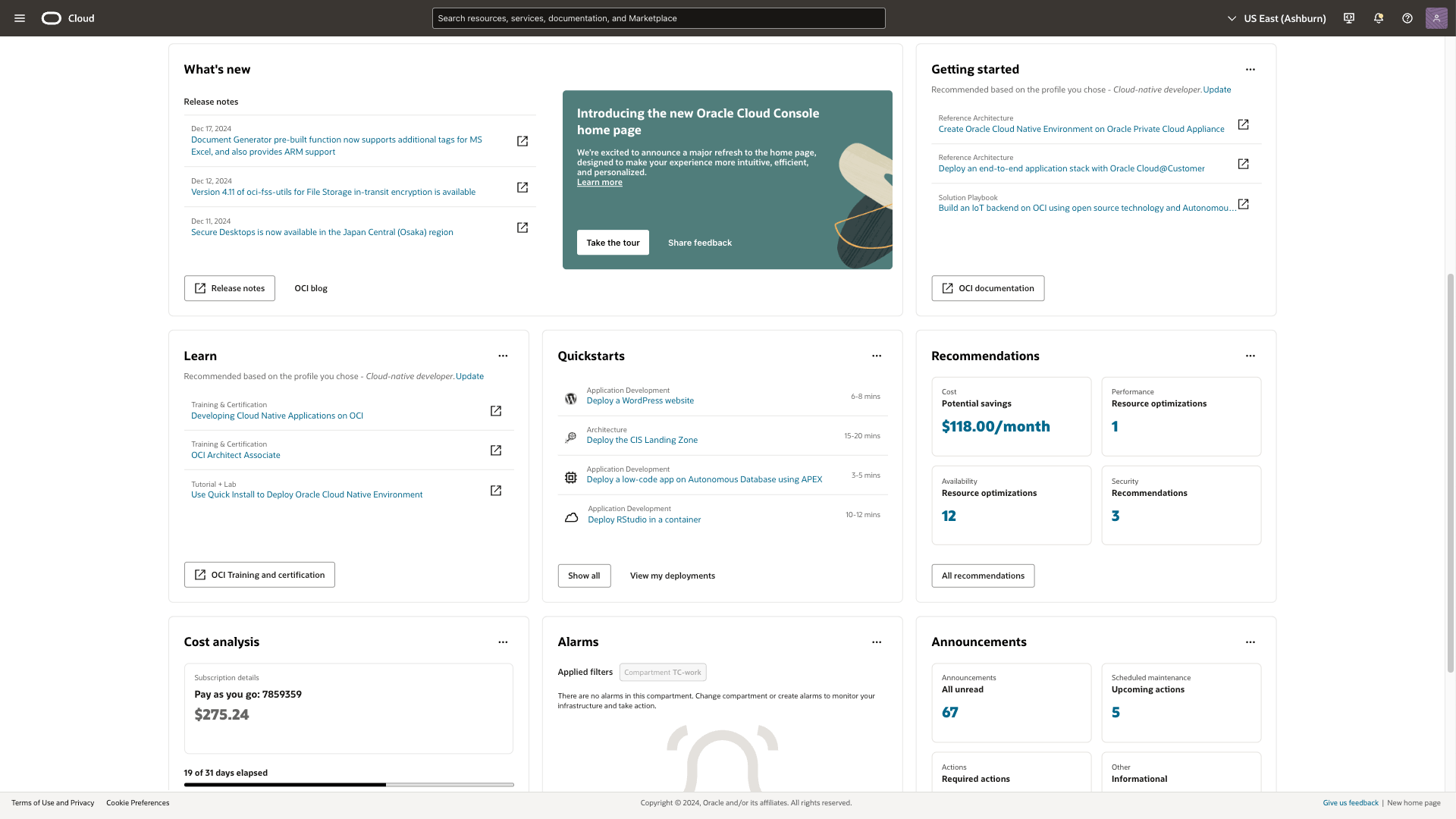 The console’s customizable homepage offers recommendations on cost, performance, security, and availability, all tailored to your OCI environment.