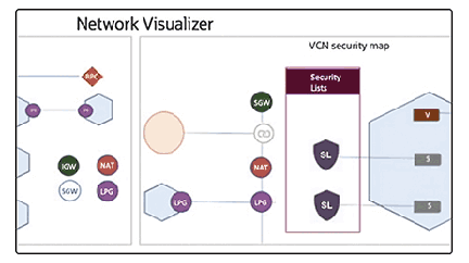 The Network Visualizer provides a diagram of the implemented topology of all VCNs in a selected region and tenancy, including dynamic routing gateways, virtual cloud networks, customer premises equipment.