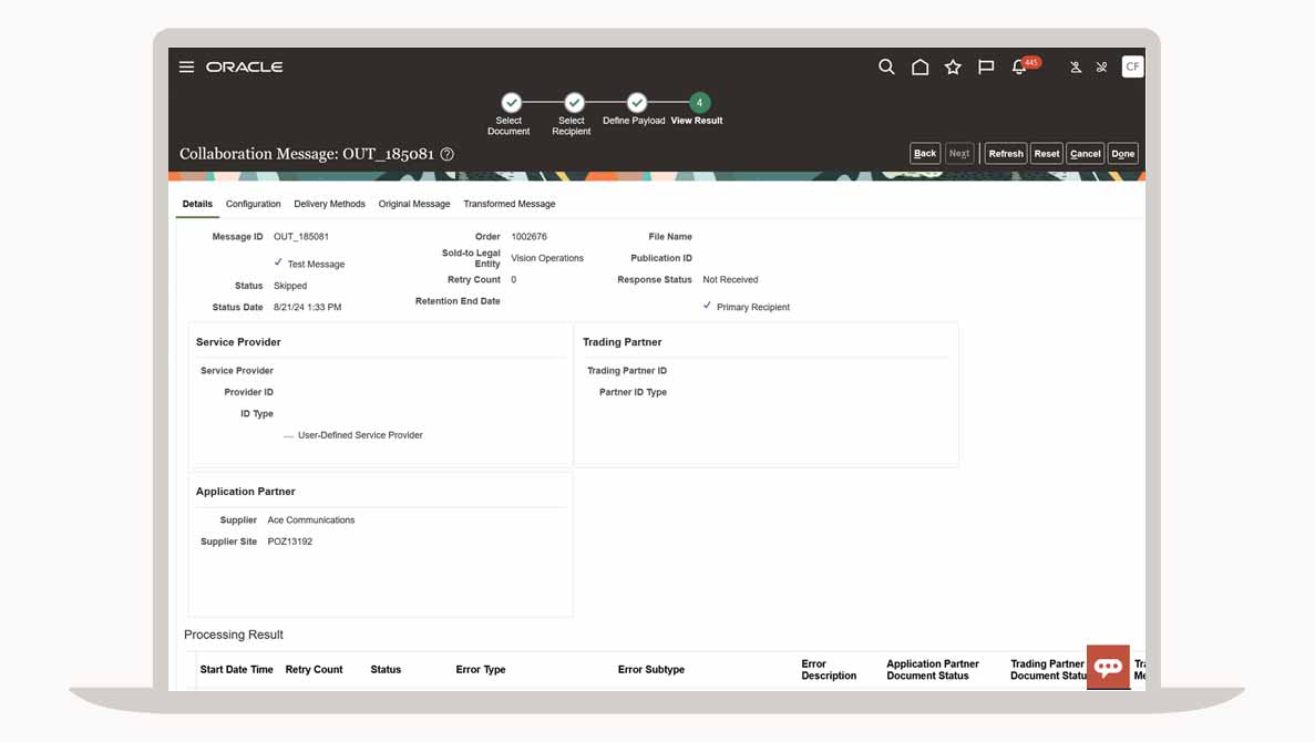 如果 B2B 消息出现问题,应用将提供有关消息配置、处理、有效负载和报错的完整详细信息。您可以编辑和重新处理消息以解决报错,如果已多次处理,还可以查看消息的完整历史记录。