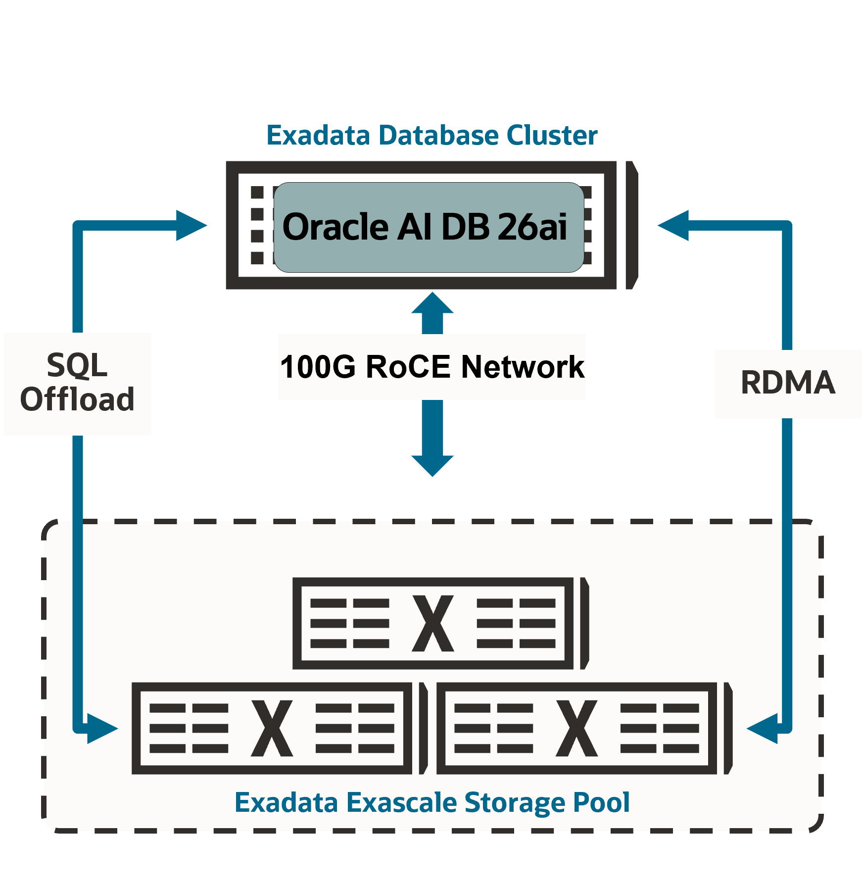 Oracle AI Database 26ai sends intelligent data requests – RDMA for OLTP and Smart Scan for AI and Analytics – directly to pooled Exascale storage servers, taking advantage of Exadata's extremely low microsecond read latency, millions of read IOPS, and extraordinary scan throughput.
