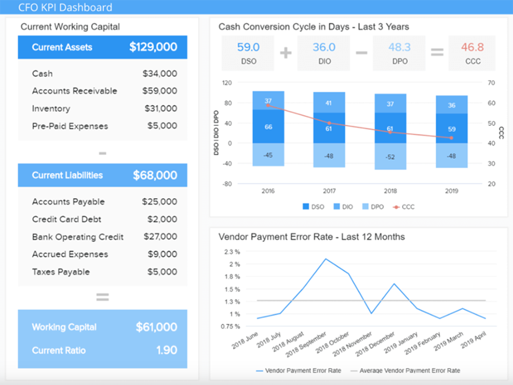 This image shows the kind of KPIs and graphs a CFO might want on a dashboard, such as working capital, current liabilities, vendor payment error rate, and more.