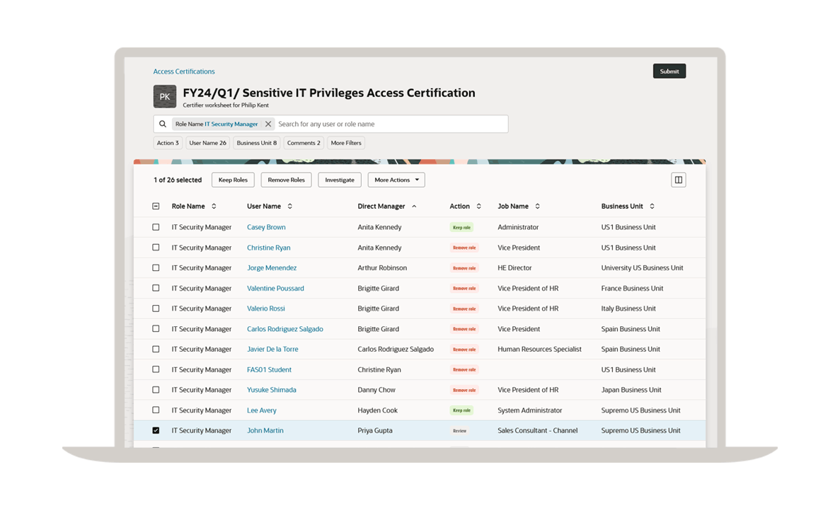 Digitize user access reviews and certify user access to sensitive functions. Automatically route approval workflow to direct managers and process owners. Continuously certify users with high-risk access for security and audit requirements.