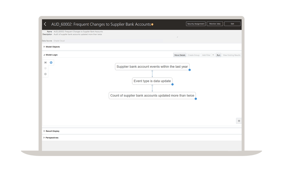 Continuous monitoring of changes to critical configurations. Automate risk-based analysis of setup and master data changes. Leverage a library of best practice configuration rules. Easily add intelligence such as frequency and threshold values to audit controls of critical ERP setup and configuration data such as supplier bank accounts.