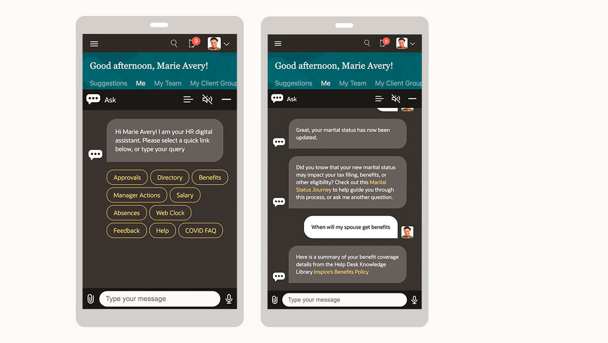 Provide a conversational AI digital assistant that gets employees immediate answers to questions and helps them easily complete transactions.