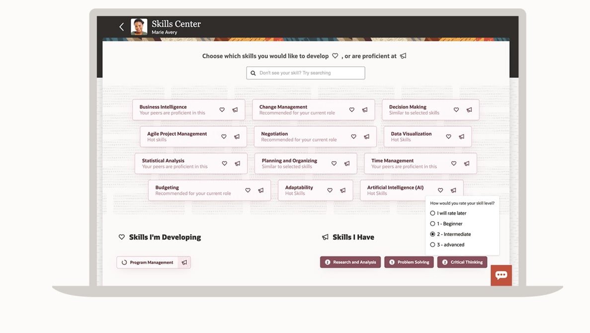 Help business leaders develop an agile workforce and drive business outcomes by providing them with a visualization of how employees’ skills align with the skills requirements of their specific roles.
