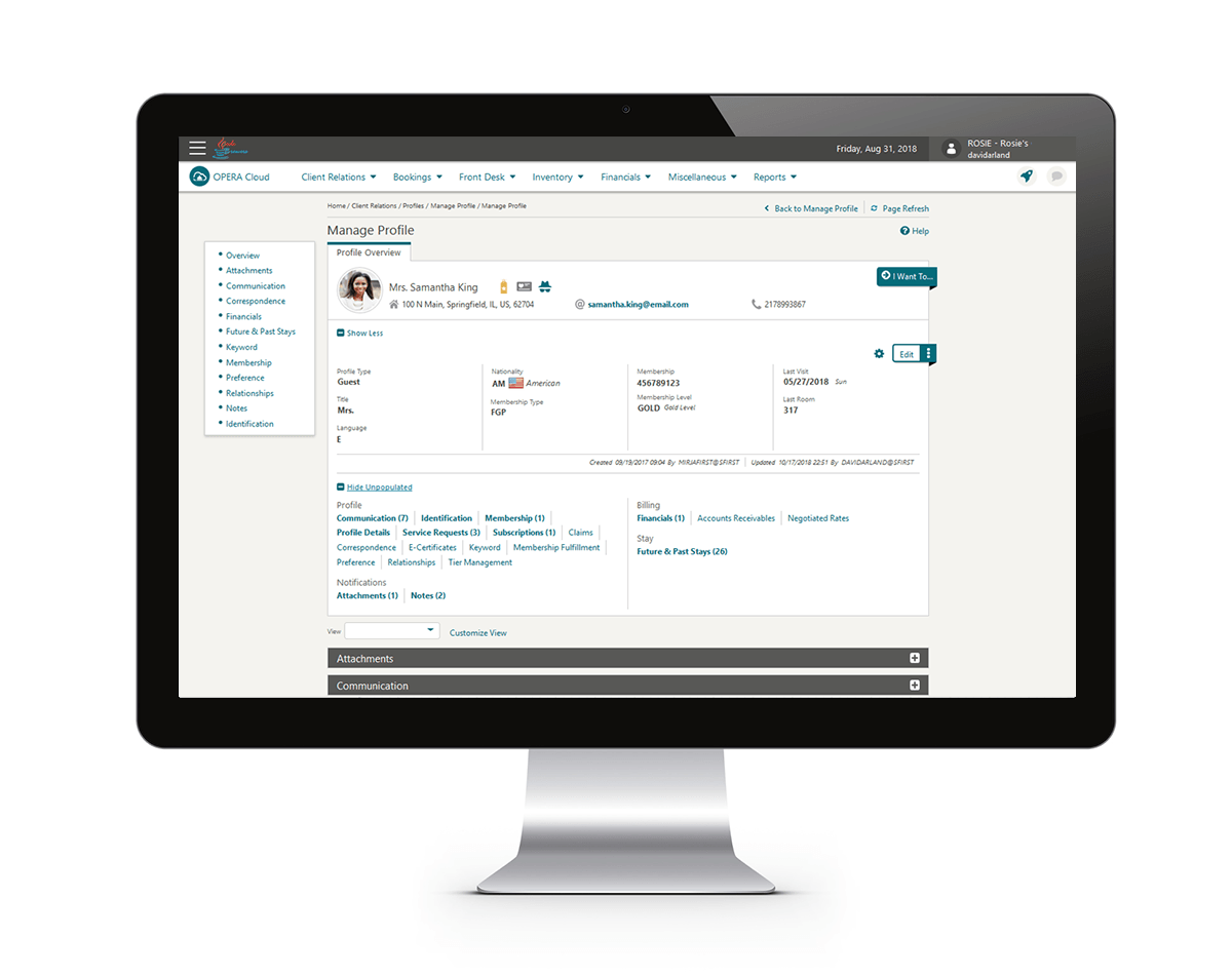 La vista del perfil del cliente permite ver toda la información relacionada con el cliente, incluida la comunicación, estadías pasadas, detalles de las asociaciones y preferencias de clientes.