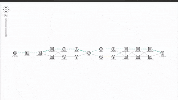 Poniżej przedstawiono przykładowy przebieg obwodu klienta w sieci operatora. Klient zadzwonił, zgłaszając problemy z wydajnością. Dzięki możliwości pełnego odwzorowania logicznego obwodu klienta oraz dzięki temu, że sieć jest w pełni zarządzana przez Assure1, możemy poniżej zobaczyć, gdzie wystąpił problem z routingiem BGP. Ścieżka zwrotna przełączyła się na ścieżkę zapasową, która również doświadcza problemów z wydajnością i została zaznaczona na żółto.