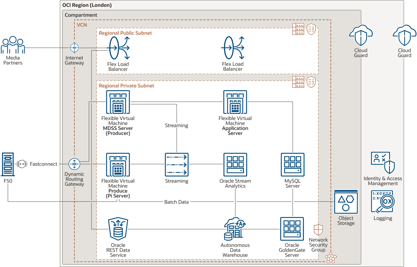 • Oracle REST data services expose the collected data from Oracle Autonomous Data Warehouse to media partners, with an arrow going from the REST Data Service in the private subnet to a flex load balancer in the public subnet.