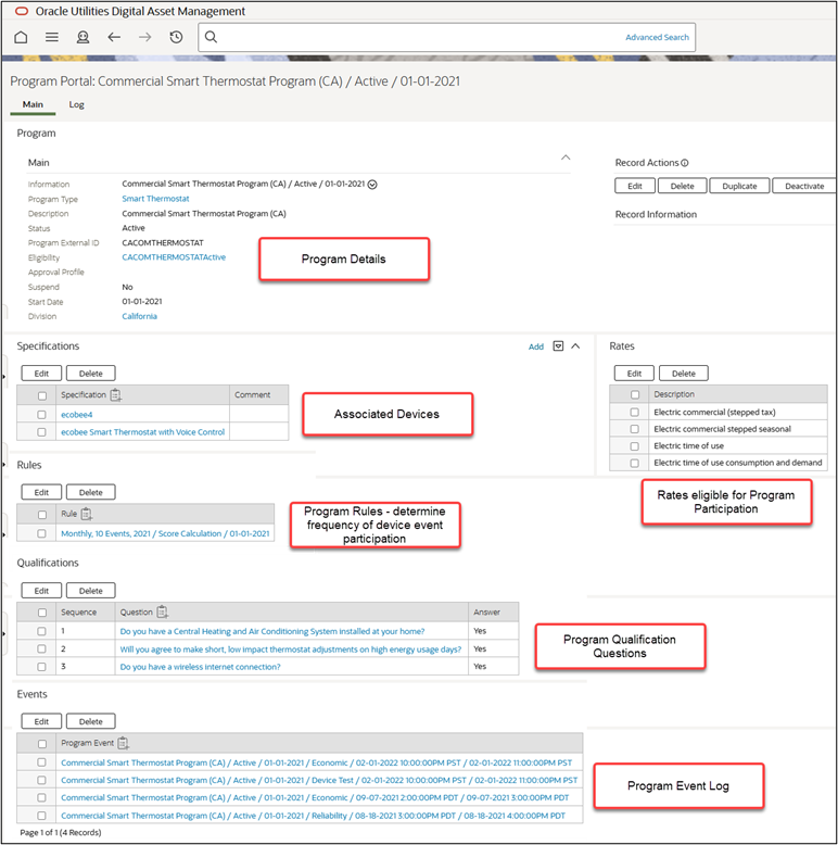 Provides the Program Manager with the ability to define the criteria to determine which programs are available to which customers, the devices related to a program, and the enrollment qualification questions that must be met in-order-to enroll a customer. The programs rules, that drive the identification of which devices are eligible to participate when a program event is called, are also associated to the Program record.