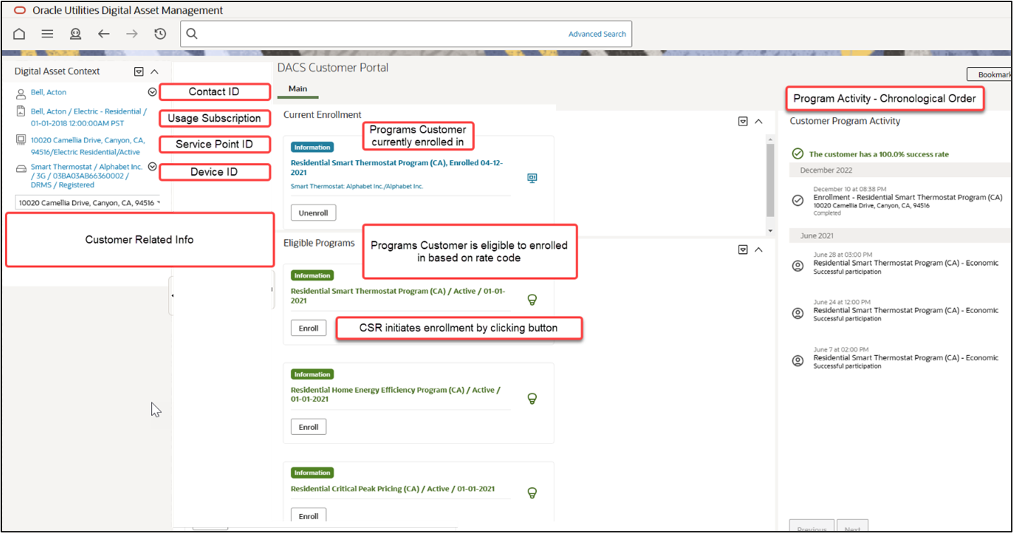 Customer Service Representatives can view which programs a customer is enrolled in as well as other programs they are eligible for. Enrollment is initiated from the portal. The portal also provides a chronological timeline of the customer’s program and related event activity.