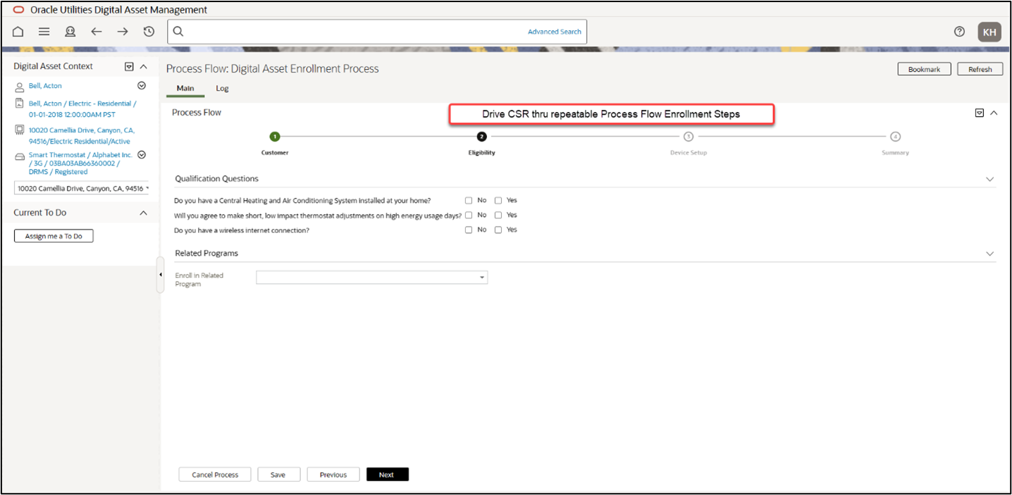 Configurable, repeatable Enrollment Process Flow drives the interaction between the Customer Service Representative and the customer during the enrollment interaction.